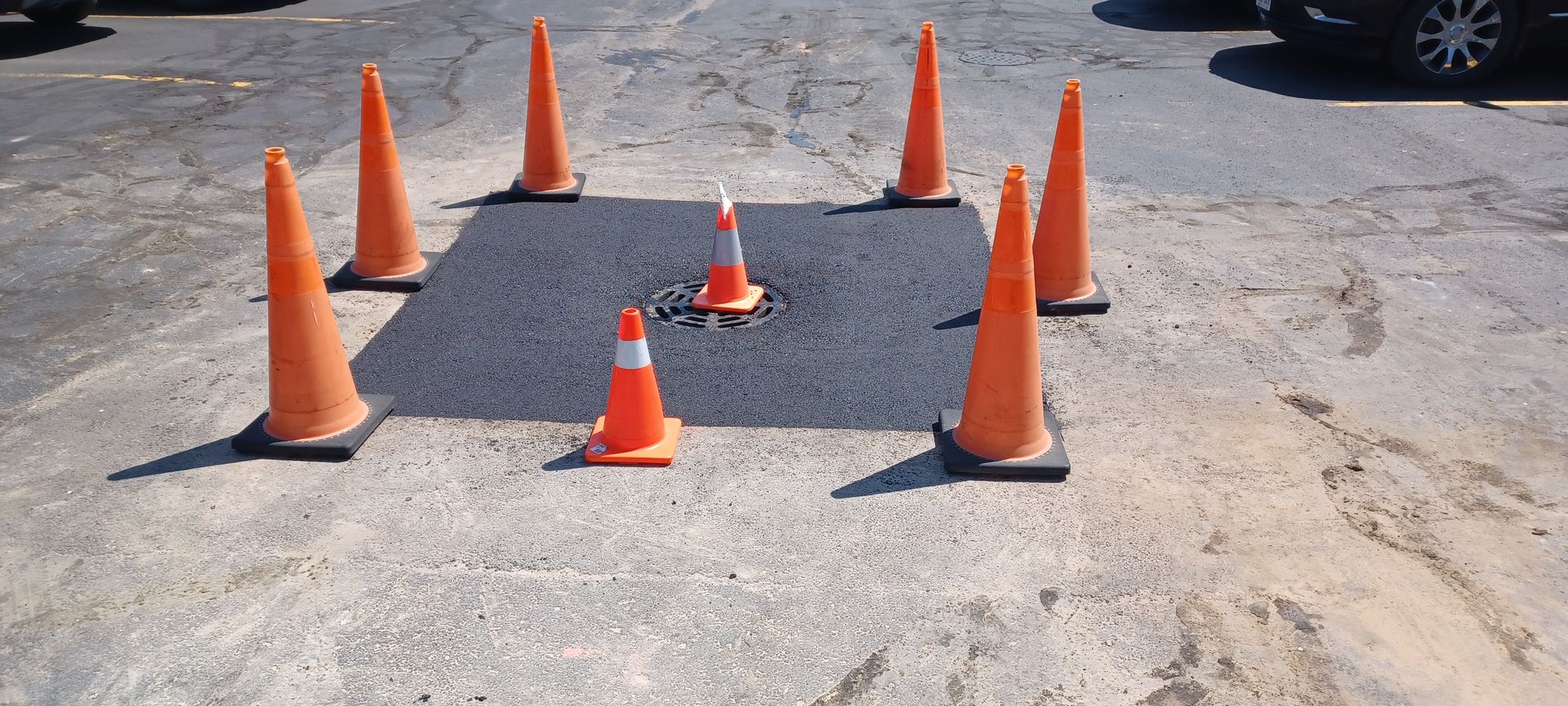 A catch basin is constructed of a concrete cone, reducer top, riser rings and a steel frame and grate. Over time, asphalt will shrink from around the catch basin frames and water will often seep into that void before it has a chance to drain into the catch basin.